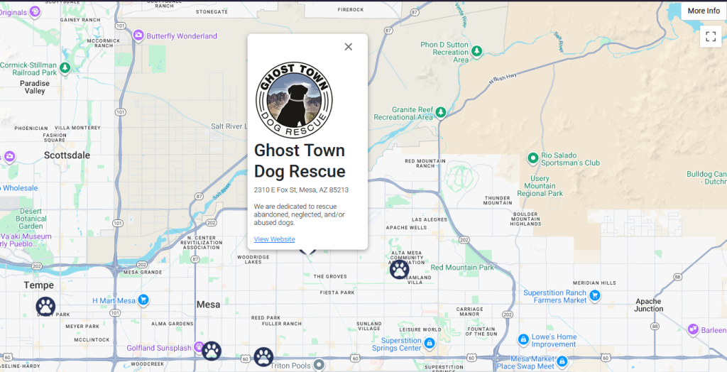 I have missed my pup a lot and realized just how much happiness a pet brings us, so I put together a small app using React that shows off a handful of different pet adoption businesses here in the East valley of Arizona. To get this project moving, I used the Google Maps component library from @react-google-maps/api. That library had a lot of examples online and it was easy to get up and running with it.